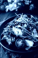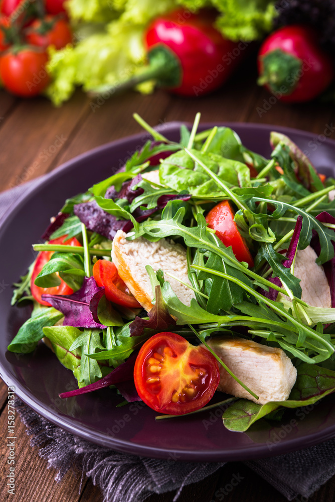 Fresh salad with chicken, tomatoes and mixed greens (arugula, mesclun, mache) on wooden background close up. Healthy food.