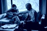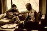 An elderly professor instructs a young student on guitar techniques in a cozy music classroom, fostering learning and creativity.