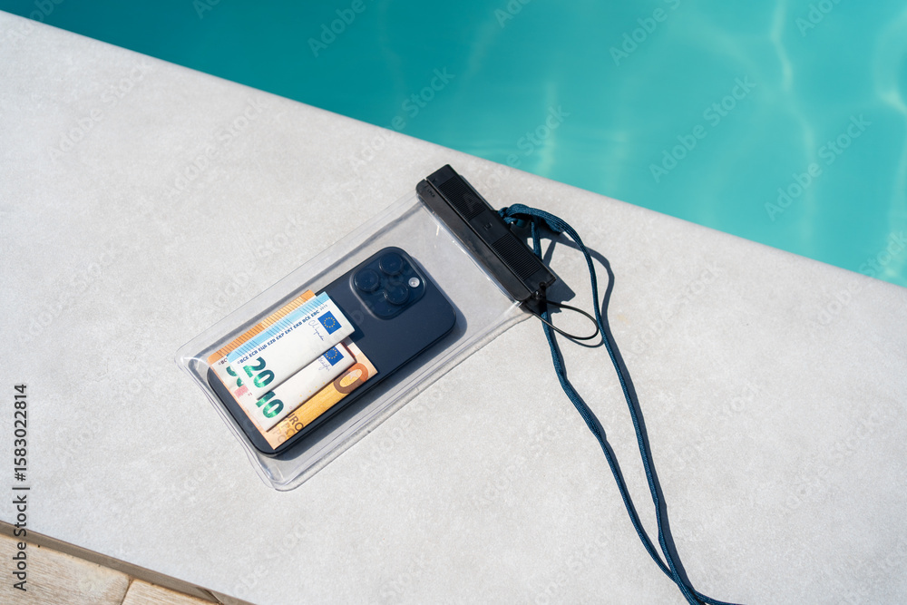 Waterproof case with money and a smartphone on the background of the pool on a sunny summer day