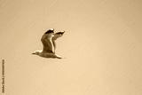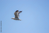 A lone seagull gracefully soars through the vast expanse of the bright blue sky