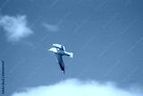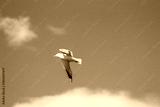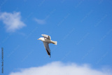 A lone seagull gracefully soars through the vast expanse of the bright blue sky