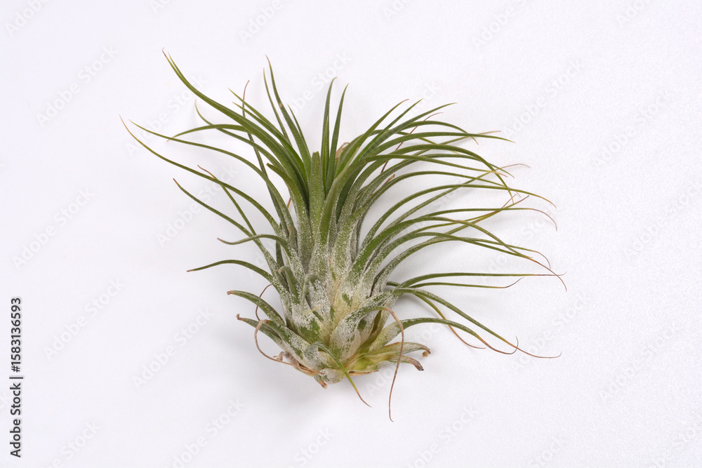 A green air plant (Tillandsia) with slender leaves is centrally placed on a clean white background