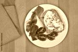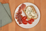 A white plate featuring prosciutto, sliced tomatoes, and an open-faced sandwich with a creamy spread is placed on a wooden surface next to a folded green cloth