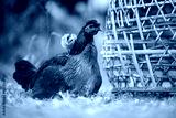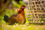 Hen and chicken outdoors eating on a green grass. Organic poultry farm. nature farming. Free range chickens.