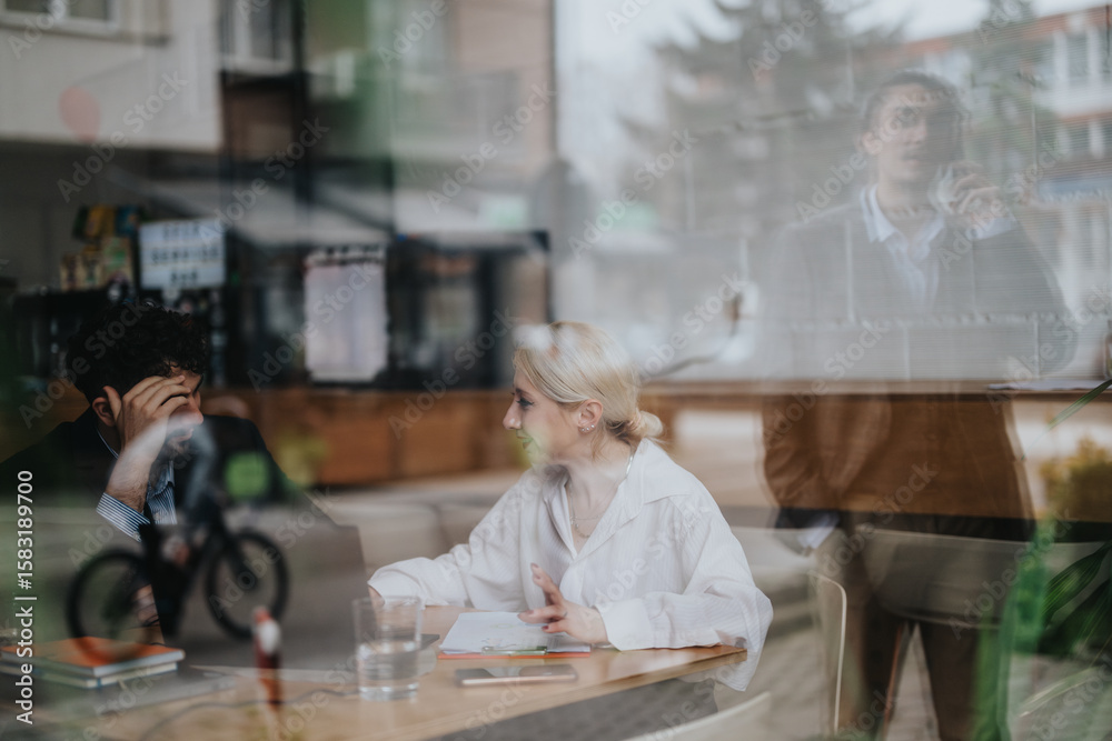 Two individuals collaborate during a business meeting at a stylish co-working space, showcasing productivity in a casual yet professional environment.