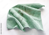 Dirty old unclean green microfiber cloth with grease stains and cat hair. Grunge and rough rag surface of fabric.