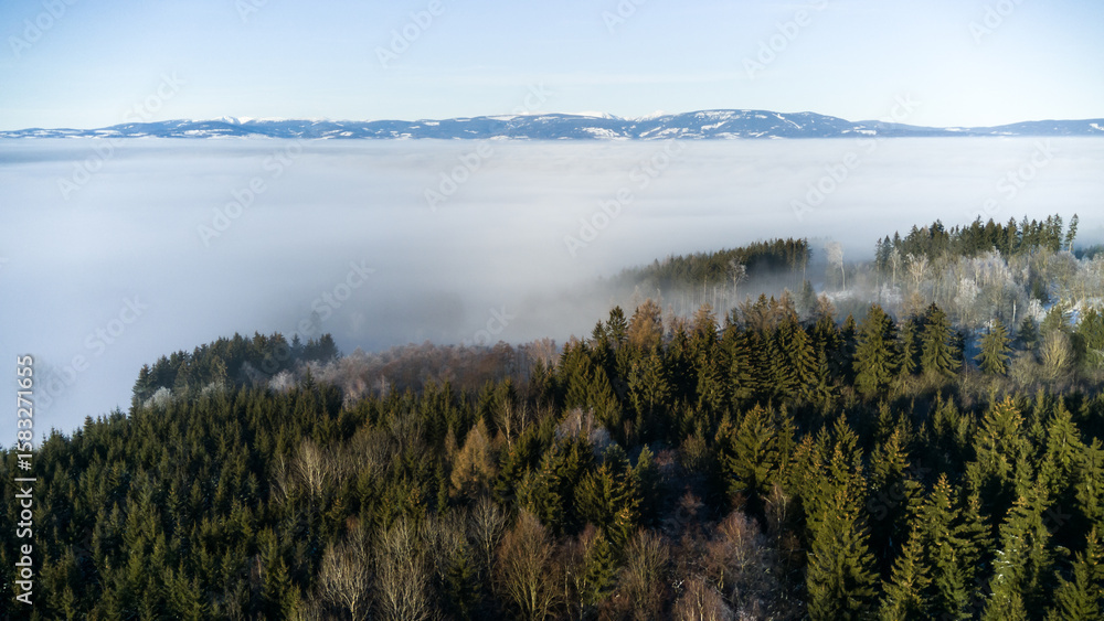 View of the snowy landscape of the Krkonoše Mountains during an inversion