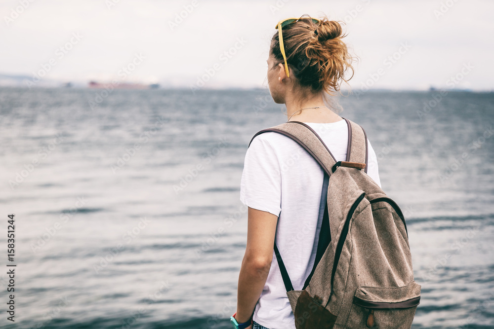 A girl in a white T-shirt with a backpack looks at the sea, an image with retro toning