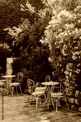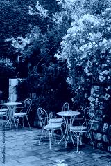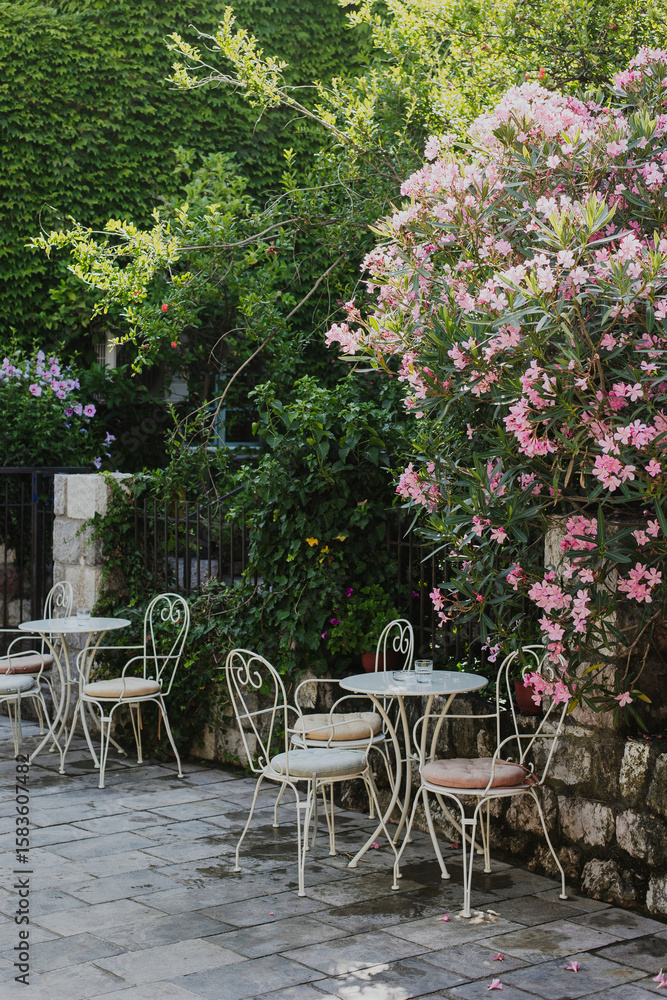Empty pretty cafe by the sea in Przno near Budva, Montenegro. Travel destination in Montenegro.