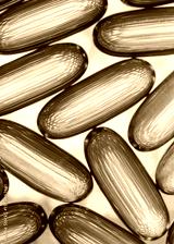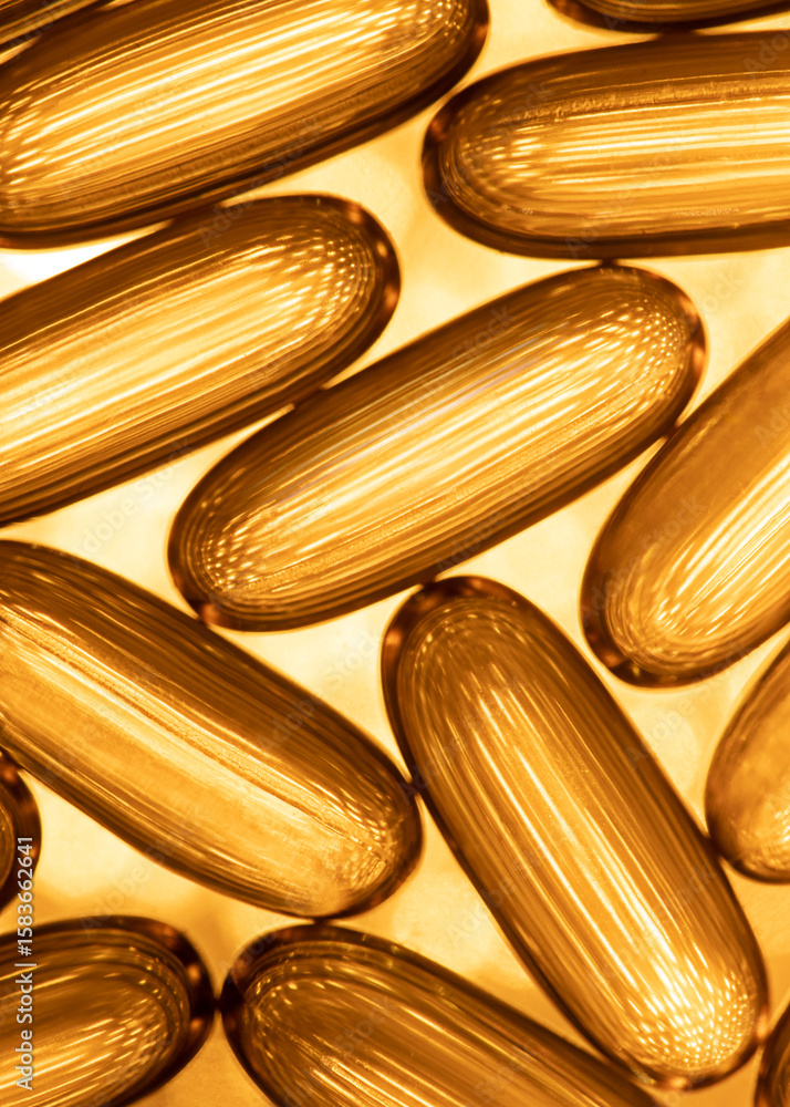 Close-up of shiny yellow vitamin capsules, healthy concept