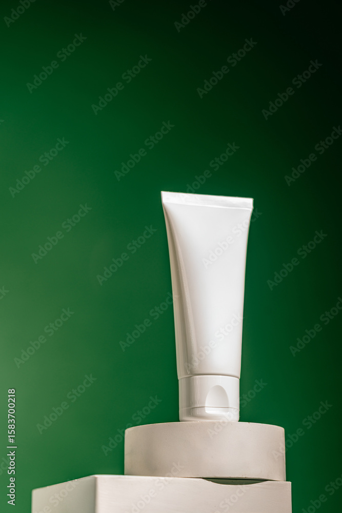 A white tube of soothing face cream against a green background, ideal for use in skincare ads, organic product branding, wellness blogs, or eco-friendly cosmetics packaging design.