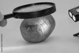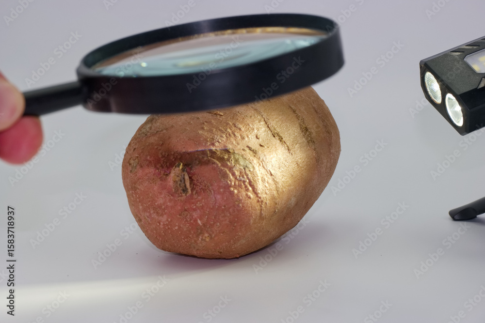 Golden potato examined with a magnifying glass and flashlight at a science demonstration for curious minds