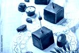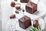 Chocolate souffle candy dessert with chocolate praline and cocoa beans on wooden background
