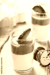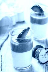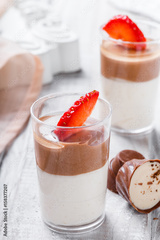 Tasty mousse dessert with chocolate, strawberry and praline in a glass on light background close up. Delicious dessert