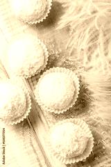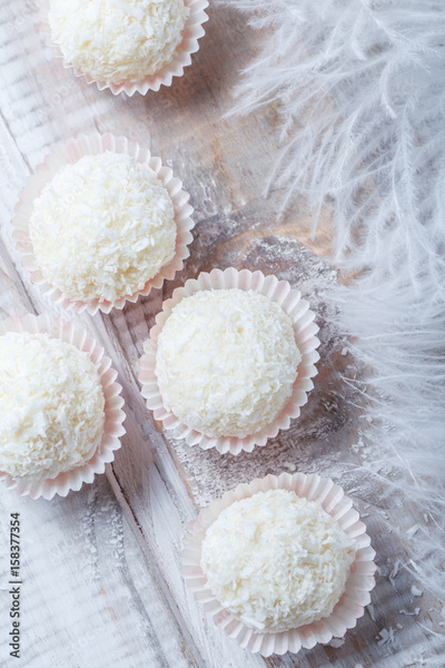 Homemade white truffles candy dessert sprinkled in coconut chips