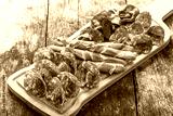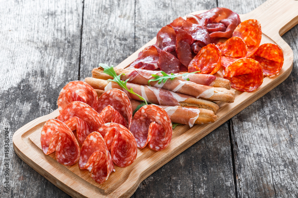Antipasto platter cold meat plate with grissini bread sticks, prosciutto, slices ham, beef jerky, salami on cutting board