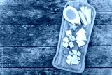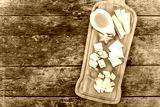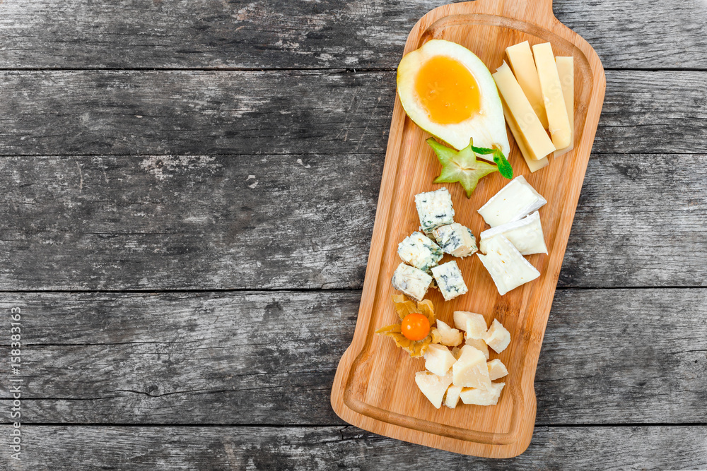 Cheese platter garnished with pear, honey, carambola, physalis o