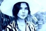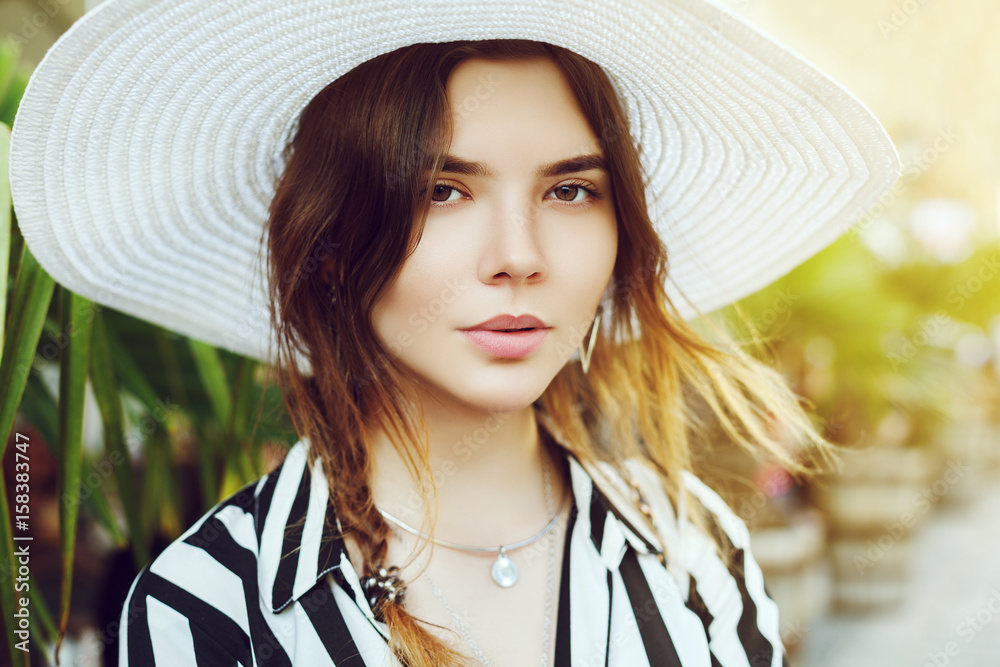 Outdoor close up portrait of young beautiful girl posing in street with palms. Model looking at camera, wearing stylish stripped shirt, white wide-brimmed hat. City lifestyle, female fashion concept