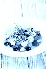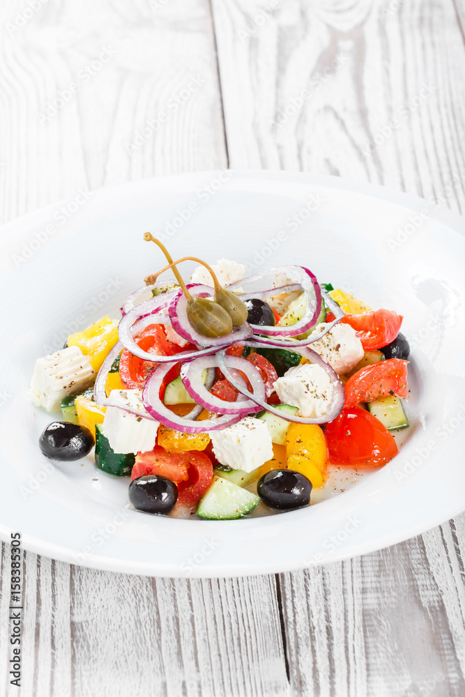 Greek salad with fresh vegetables, olives and feta cheese on wooden background close up. Top view