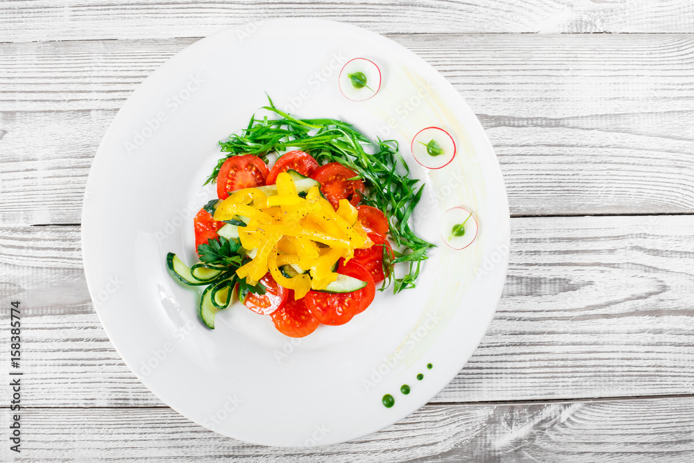 Fresh salad with cherry tomatoes, cucumber, radish, sweet pepper and onion in a plate on wooden background close up. Top view