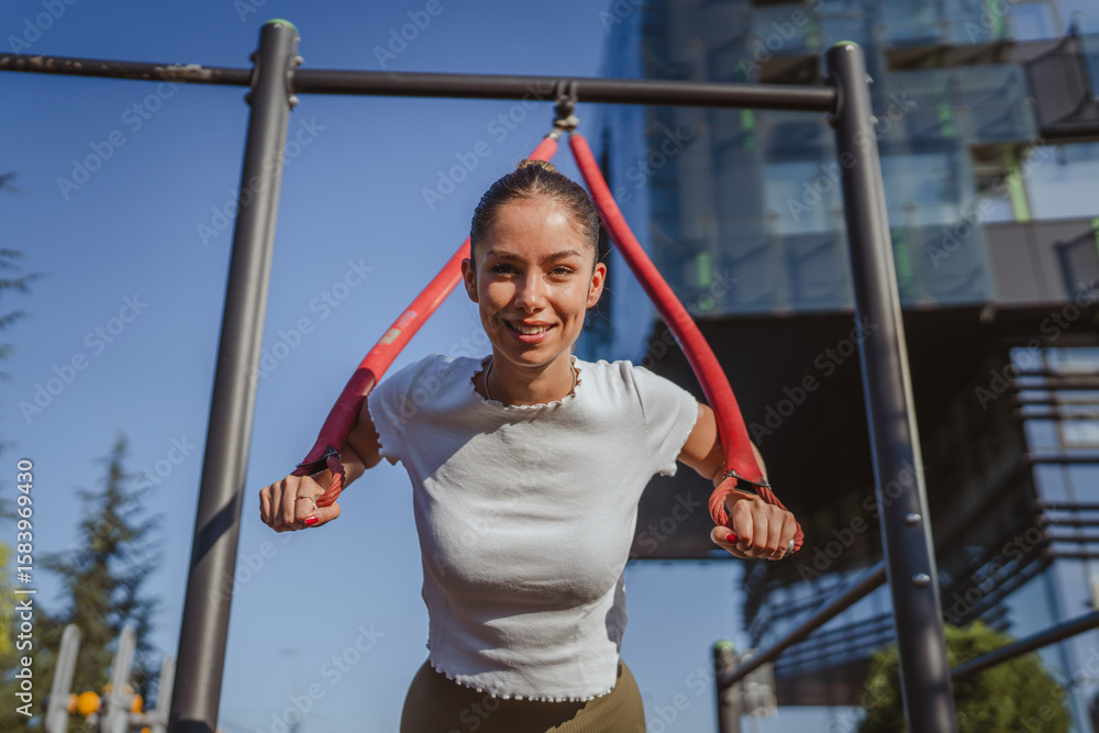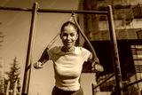 beautiful caucasian adult sports woman stretching at outdoor gym