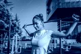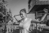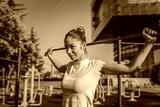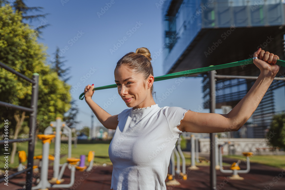 beautiful caucasian adult sports woman stretching at outdoor gym
