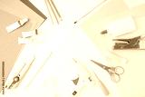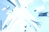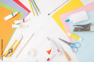 Creative flat lay with colorful paper, glue, paint, and craft tools on clean background. Ideal for e-learning platforms, art schools, social media content, educational videos