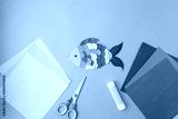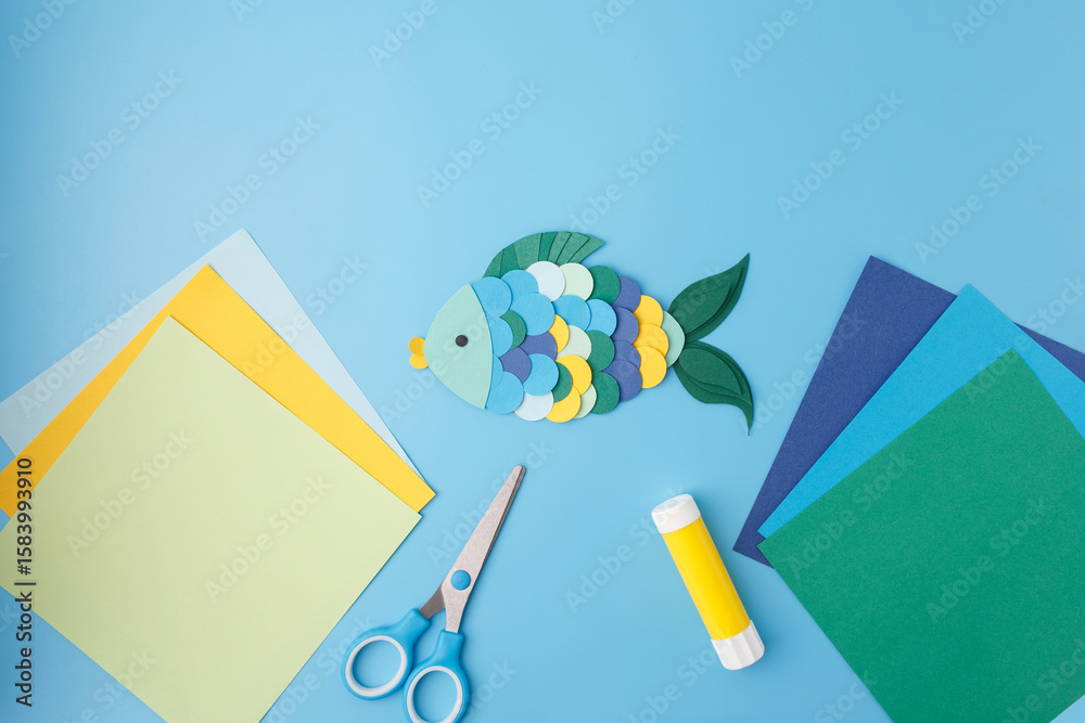 Creative kids paper art with fish cutout and supplies for DIY tutorials, educational toolkits, craft subscription boxes, afterschool programs, and home learning visuals