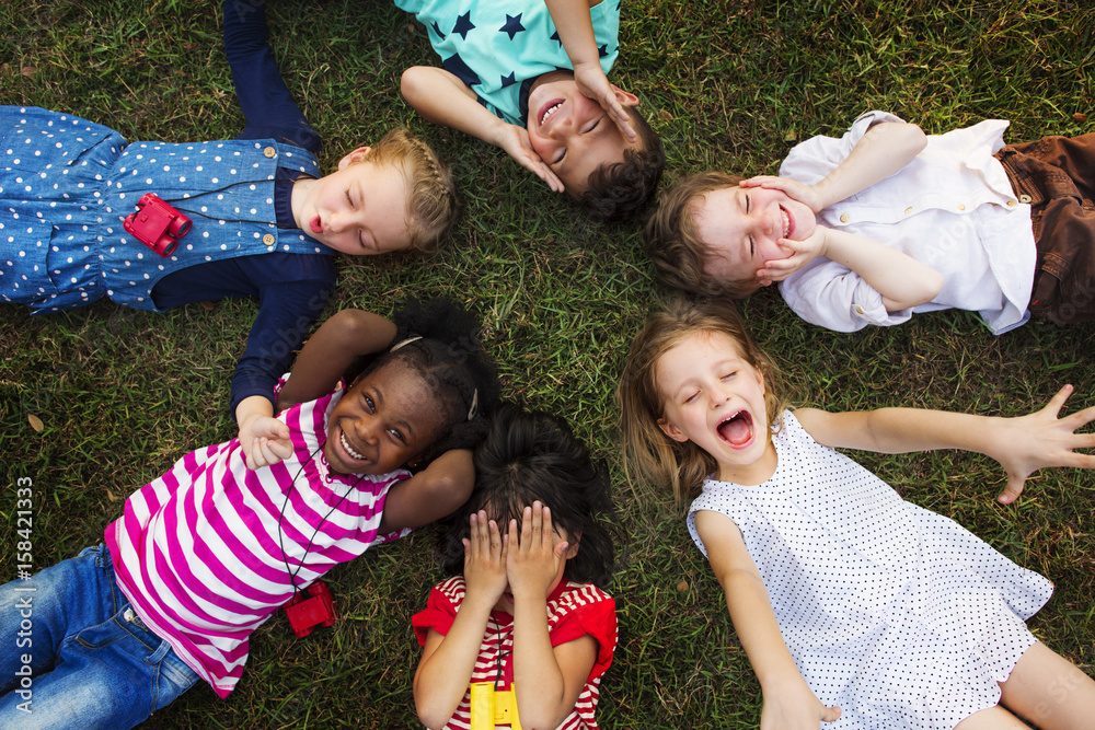 Group of kindergarten kids lying on the grass at park and relax with smiling