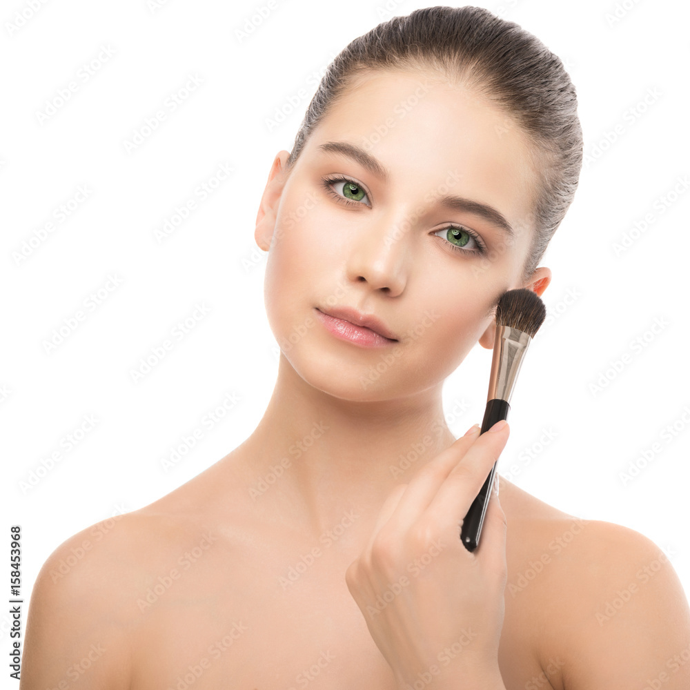 Portrait of beautiful young brunette woman with clean face. Beauty spa model girl with perfect fresh clean skin applying cosmetic brush. Youth and skin care concept. Isolated on a white background.
