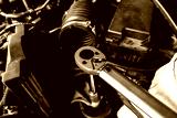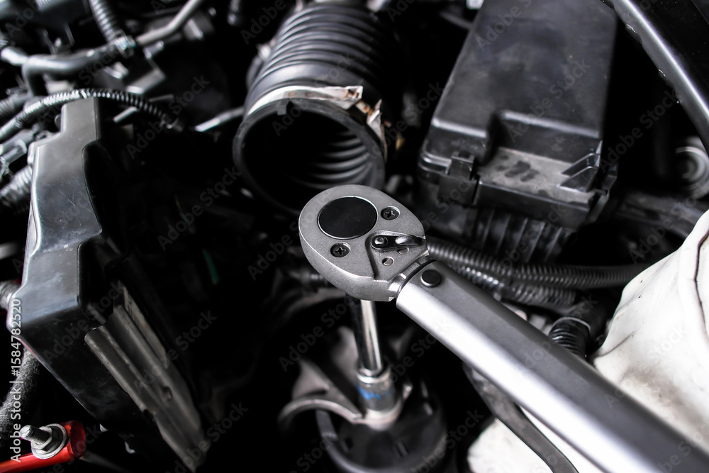 Torque wrench in use, auto repair or car maintenance and engine work with mechanic tool, automotive service.