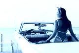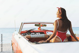 Sexy woman in red swimsuit and retro cabriolet car