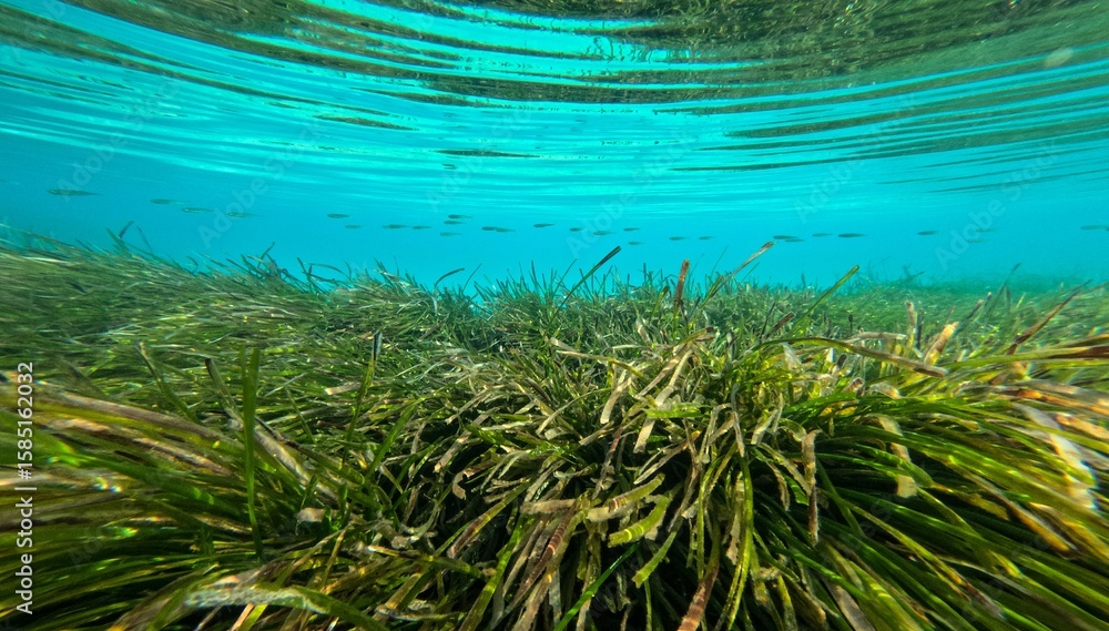 Vibrant underwater scene in Aegean sea showcasing lush seagrass with clear water above, highlighting the beauty and importance of marine life and aquatic ecosystems for environmental health.