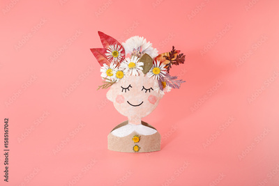 Paper doll with flower crown made from recycled cardboard on pink background, perfect for kids craft tutorials, eco education, handmade branding, greeting card design, spring promotions