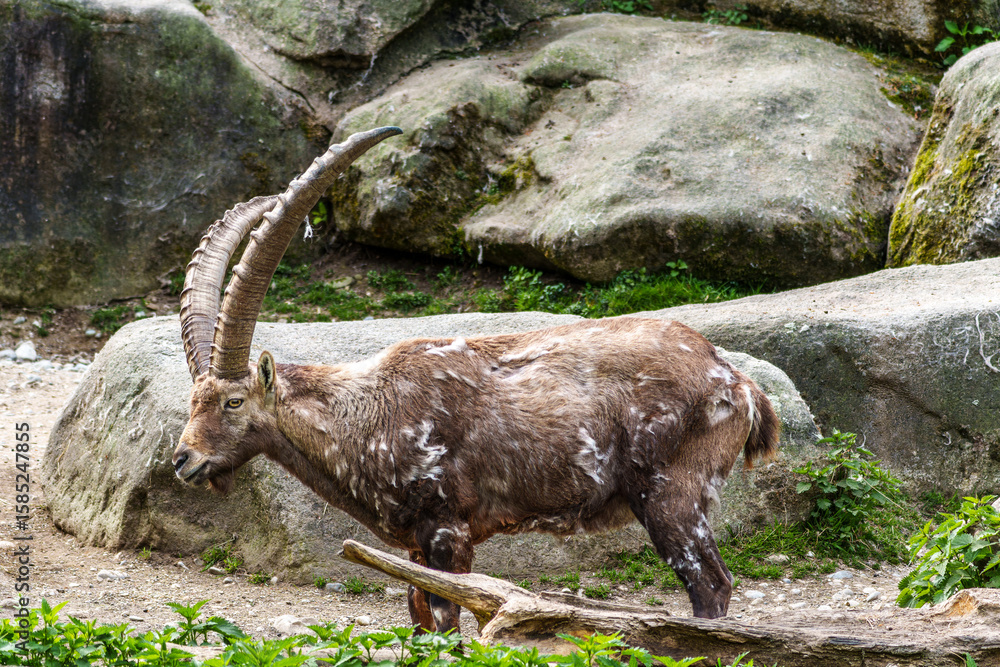 Male mountain ibex or capra ibex on a rock living in the European alps