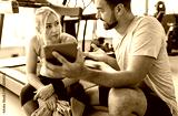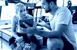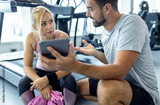 Mid adult woman and personal fitness trainer having conversation during workout break at gym.