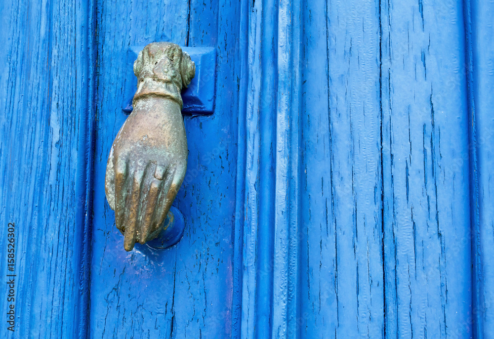 Cyclades architecture - metallic door knocker hand - old blue wooden door
