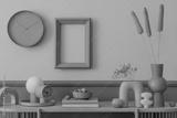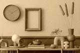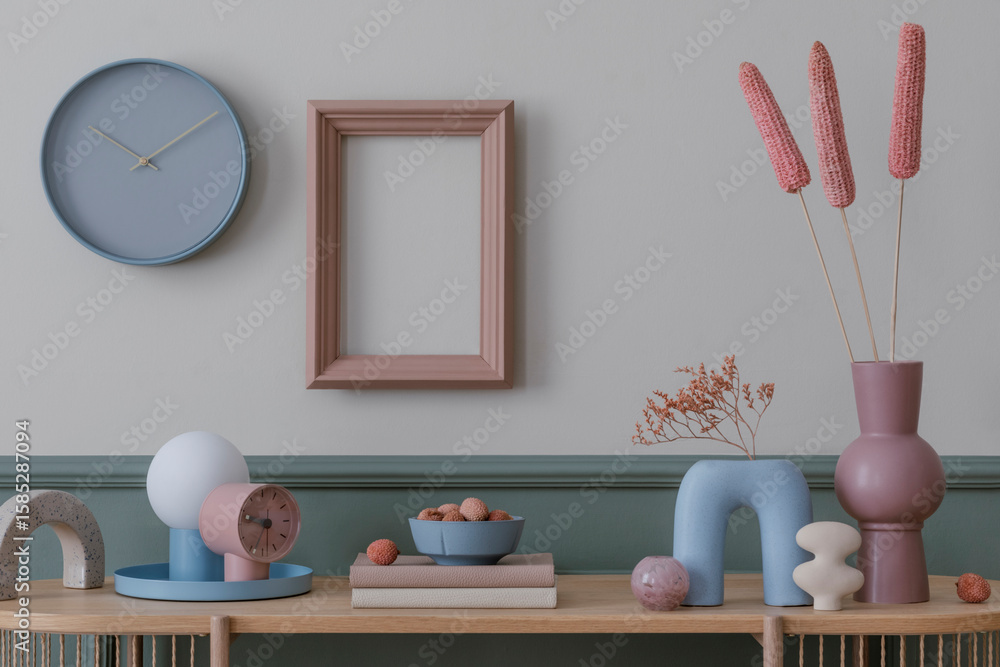Warm composition of cozy living room interior with mock up poster frame, wooden sideboard, vase with dried flowers, books, blue lamp and personal accessories. Home decor. Template.