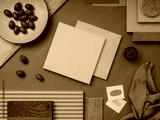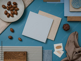 Elegant flat lay composition in blue, brown and beige color palette with textile and paint samples, lamella panels and tiles. Architect and interior designer moodboard. Top view. Copy space.