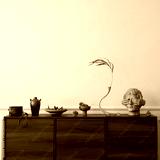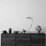 Aesthetic composition of living room interior with wooden sideboard, glass vase with dried flowers, modern sculpture, nuts, wall with stucco and personal accessories. Home decor. Template.