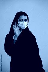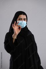 saudi arabian woman in hijaab standing with perfection sign and mask on face