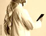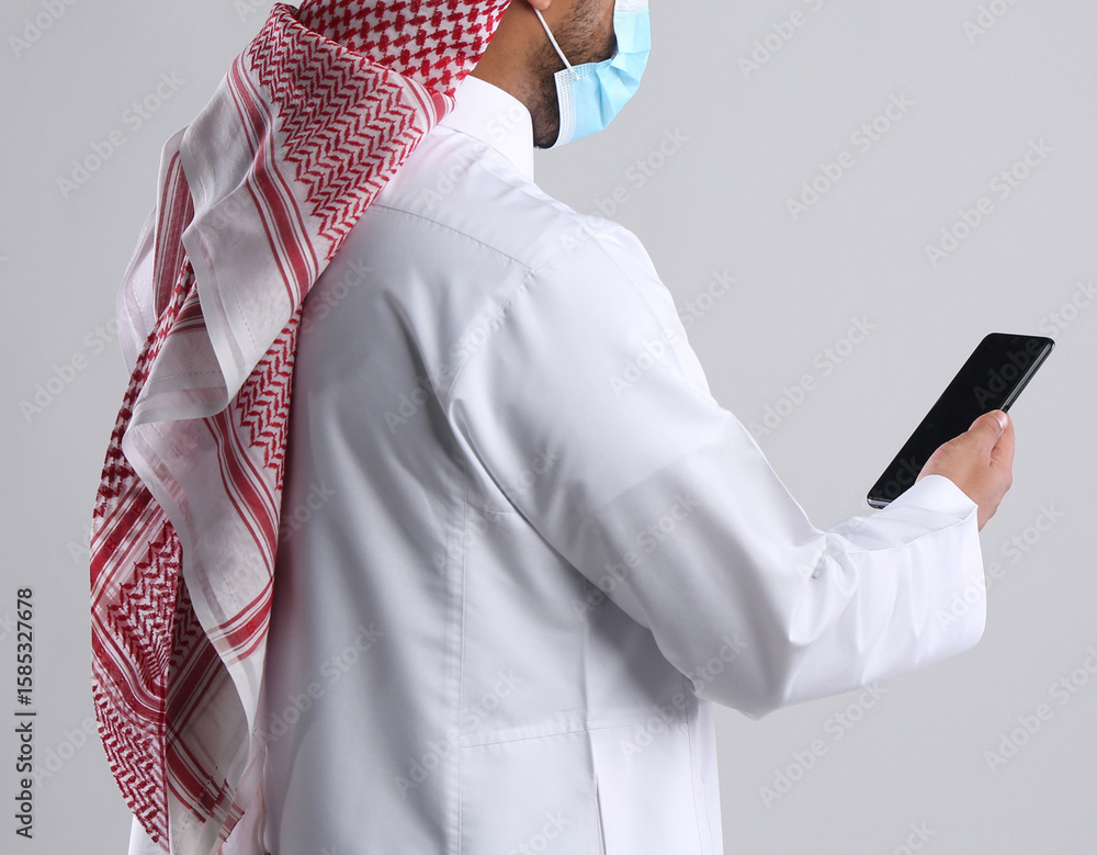 saudi arabian man in thob standing with mobile in hand looking at screen
