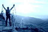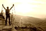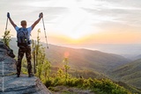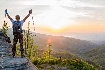 Man tourist with trekking poles on top of hill at sunrise