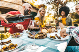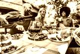 Happy friends having bbq dinner party in garden restaurant - Cheerful family drinking red wine together sitting at dining table - Food and beverage concept with guys and girls eating fresh meal