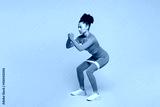 Full body side view young fitness trainer instructor woman sportsman wears orange clothes spend time in gym use elastic rubber band isolated on plain beige background. Workout sport fit abs concept.