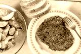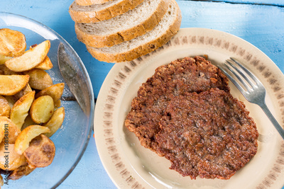 Fried minced meat burgers served on the plate above wooden blue boards