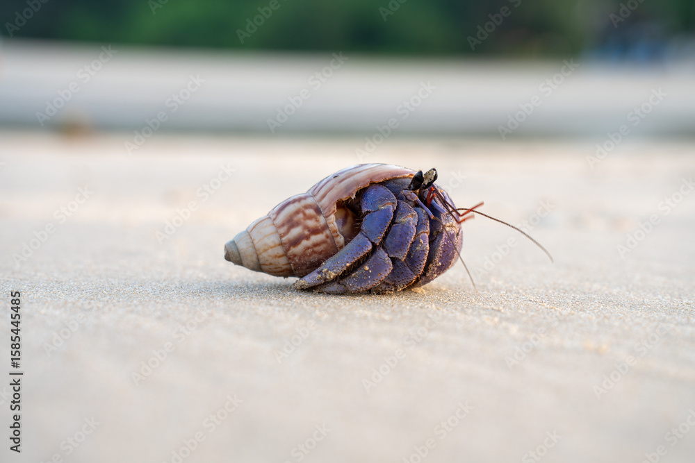 Close-up of a purple hermit crab with striped shell on sandy beach. Detailed texture and natural colors perfect for wildlife, marine, and coastal nature themes.