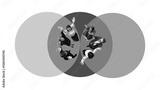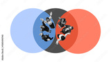 Composition showing excited business teams merging in center zone. Concept of company merger, employee unity, corporate enthusiasm, team-building, onboarding visuals.