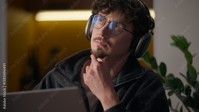 Thoughtful Hispanic guy thinking typing keyboard laptop at home programmer man working remote business freelancer searching information website cyberspace broker male looking gadget pc contemplating