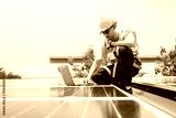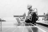 Engineer wearing safety helmet and vest using laptop to inspect rooftop solar panels, symbolizing renewable energy technology, clean power innovation, and sustainable engineering.